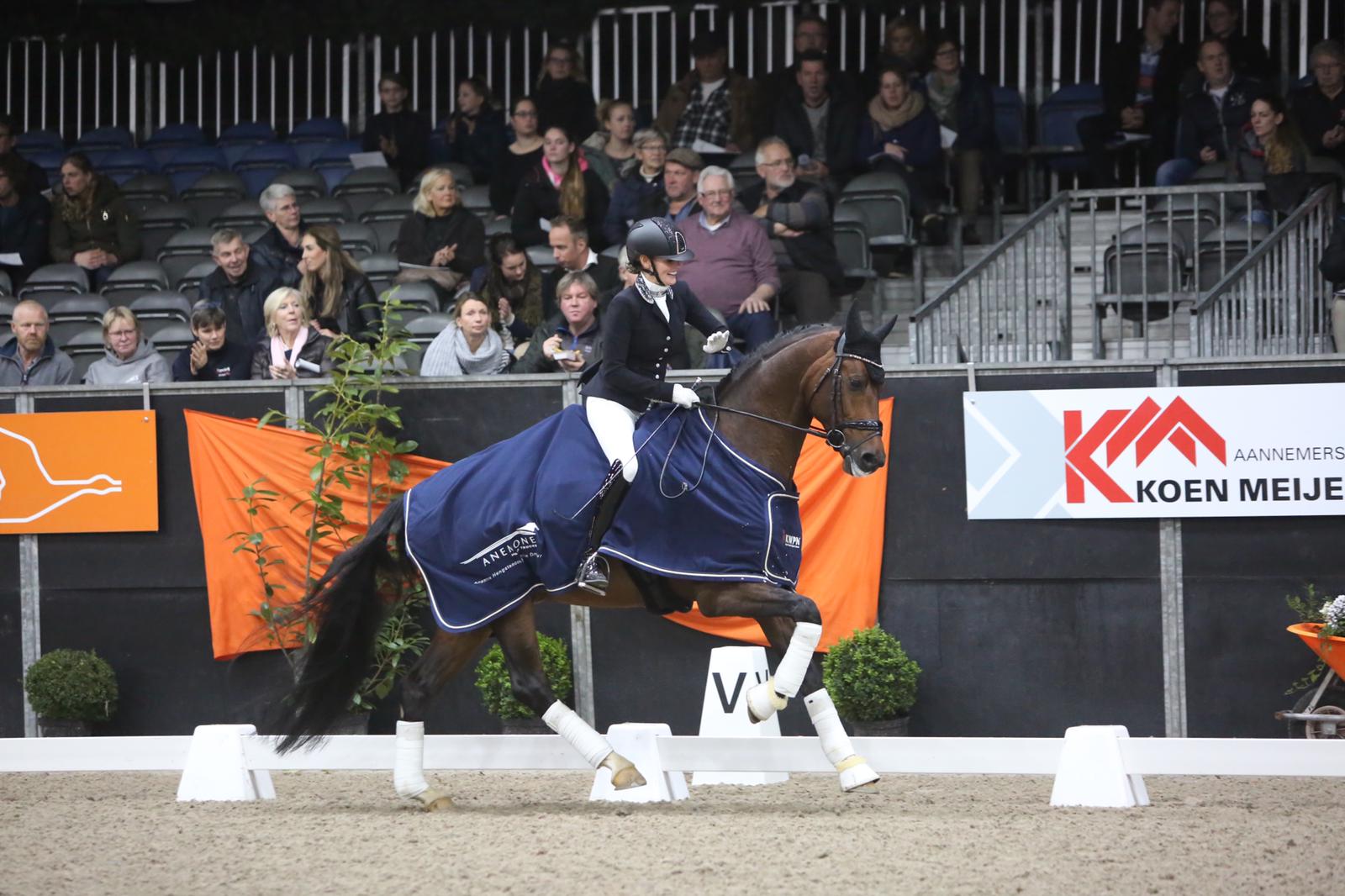 Overtuigend en onverslaanbaar, dat blijkt de Blue Hors Zack-zoon Jameson RS2 keer op keer te zijn. In de Anemone Horse Trucks Hengstencompetitie pakte hij in Zuidbroek zijn derde zege met 93 punten. Met een 10 voor de galop en 9.5 voor draf, totaalindruk en de harmonie toonde de veelbesproken Jameson RS2 (Blue Hors Zack uit Atilinda keur IBOP-dres sport-dres pref van Negro, fokker Stal 104) zich onder Marieke van der Putten wederom heer en meester in de hengstencompetitie. “We hebben hele mooie cijfers kunnen geven aan dit toptalent. Zijn stap is goed, vlug, bruikbaar en actief. In draf begon hij iets gespannen maar later zat hij dicht tegen de 10 aan. Het werd een 9.5. Hij draaft met een geweldig gebruik van het voor- en achterbeen, en blinkt ook uit in het wijken. De galop is kaarsrecht, bergop en iedere pas in balans. Hij kan schakelen en ondanks dat hij goed wakker was, bleef hij perfect in balans”, sprak juryvoorzitter Frenk Jespers enthousiast.
