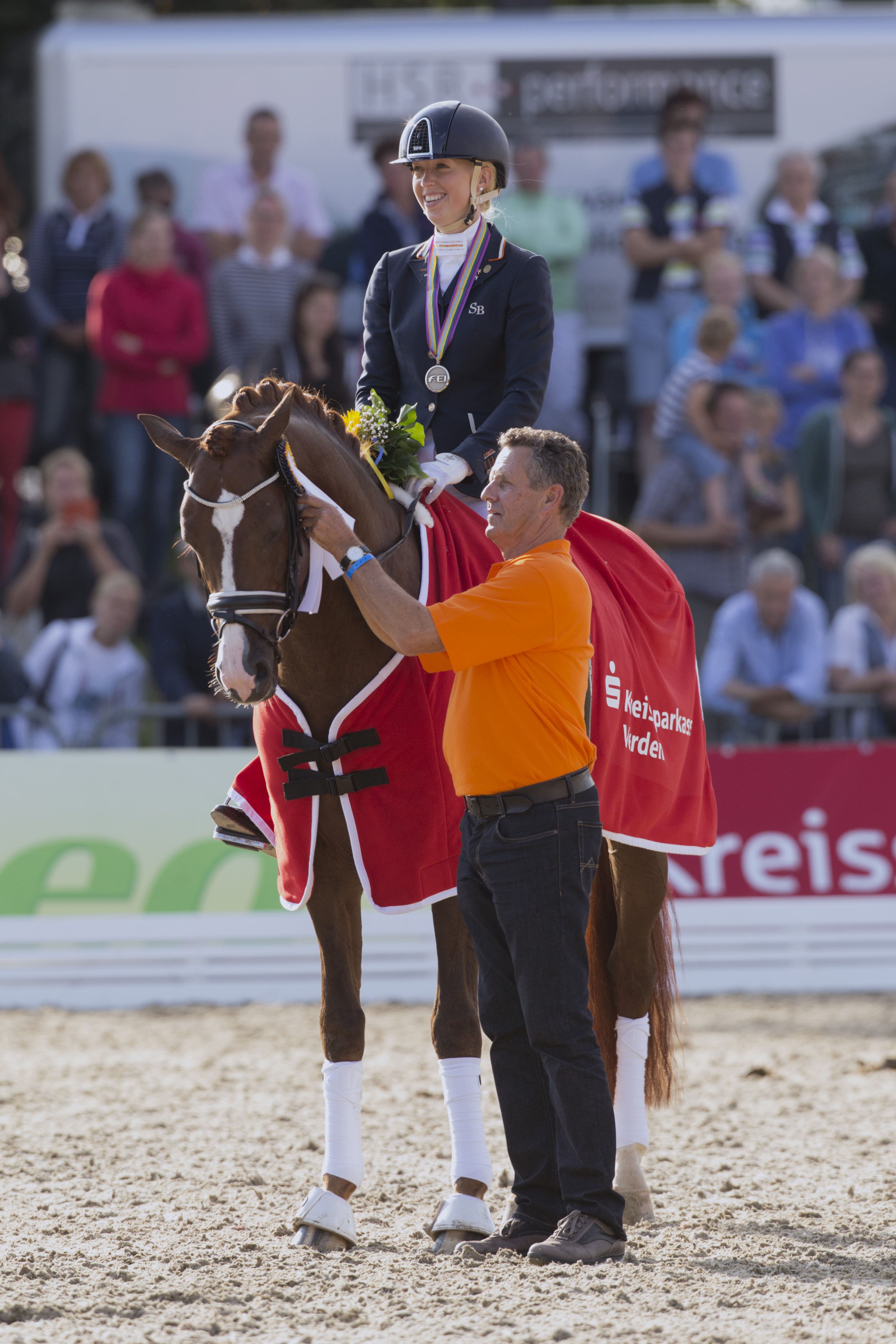 Eye Catcher hebben wij als veulen voor de helft gekocht van fokker Gerrit Snoeks. Wij hebben samen hele mooie momenten beleefd met hem, o.a. Reservekampioen KWPN-Verrrichtings- onderzoek, winnaar PAVO-Cup voor 5-jarige dressuurpaarden, Hengstencompetitie en 2x Brons op het WK voor 5-jarige & 6-jarige dressuurpaarden. In 2016 was er heel veel vraag naar hem en hebben we besloten om hem te verkopen aan Platinum Stables waar Kirsten zijn successen met hem kan doorzetten. We hebben dit jaar 3 goede nakomelingen van hem voor de KWPN-hengstenkeuring, zijn goedgekeurde zoon In Style doet het super onder Renante van Vliet en liet recent een zeer mooie collectie veulens zien. Ook hebben we een mooie 2-jarige hengst van Bordeaux uit de volle zus van Eye catcher in opfok staan die we samen hebben met zijn fokker Gerrit Snoeks.