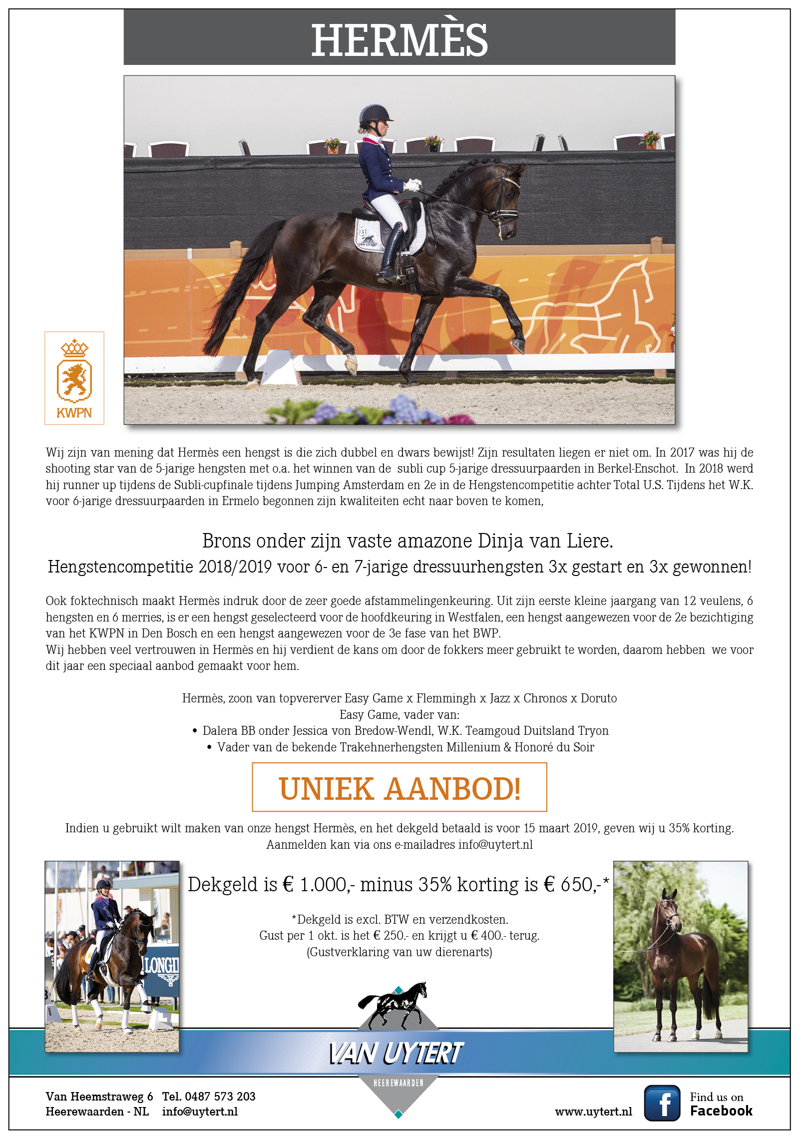 Wij hebben veel vertrouwen in Hermès en hij verdient de kans om door de fokkers meer gebruikt te worden, daarom hebben we voor dit jaar een speciaal aanbod gemaakt voor hem.